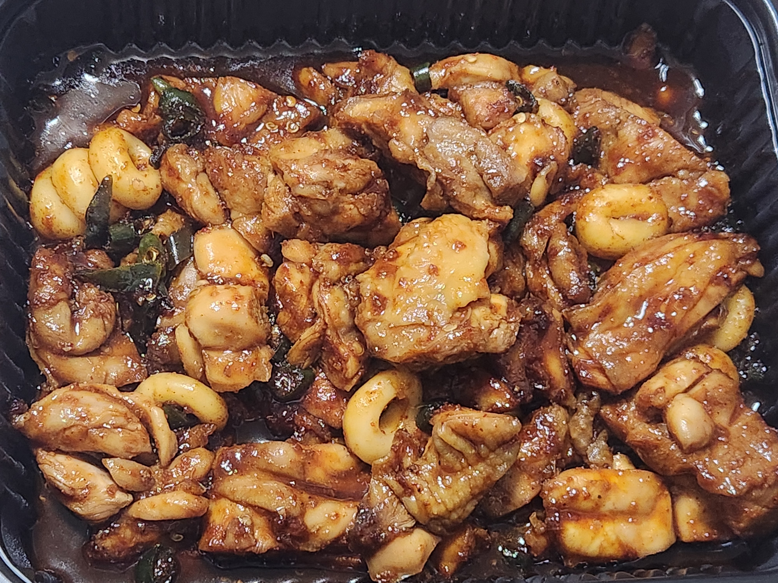 치킨이 와서 봤더니 뭔가 밋밋해보이는 색감이다. 요기요에서 배달시킬때는 더 진한 간장색이었는데 말이다. 실제로 맛도 까만양념이라는 이름값이 좀 아깝다 싶을정도로 간이 약하게 되어있다. 뿌링클부터 시작해서 치토스치킨, 고추치킨, 소이갈릭류치킨 등 폭발적인 나트륨 함량을 자랑하는 치킨들에 익숙해서일까, 기영이 까망치킨은 짠맛이 조금 아쉽다.